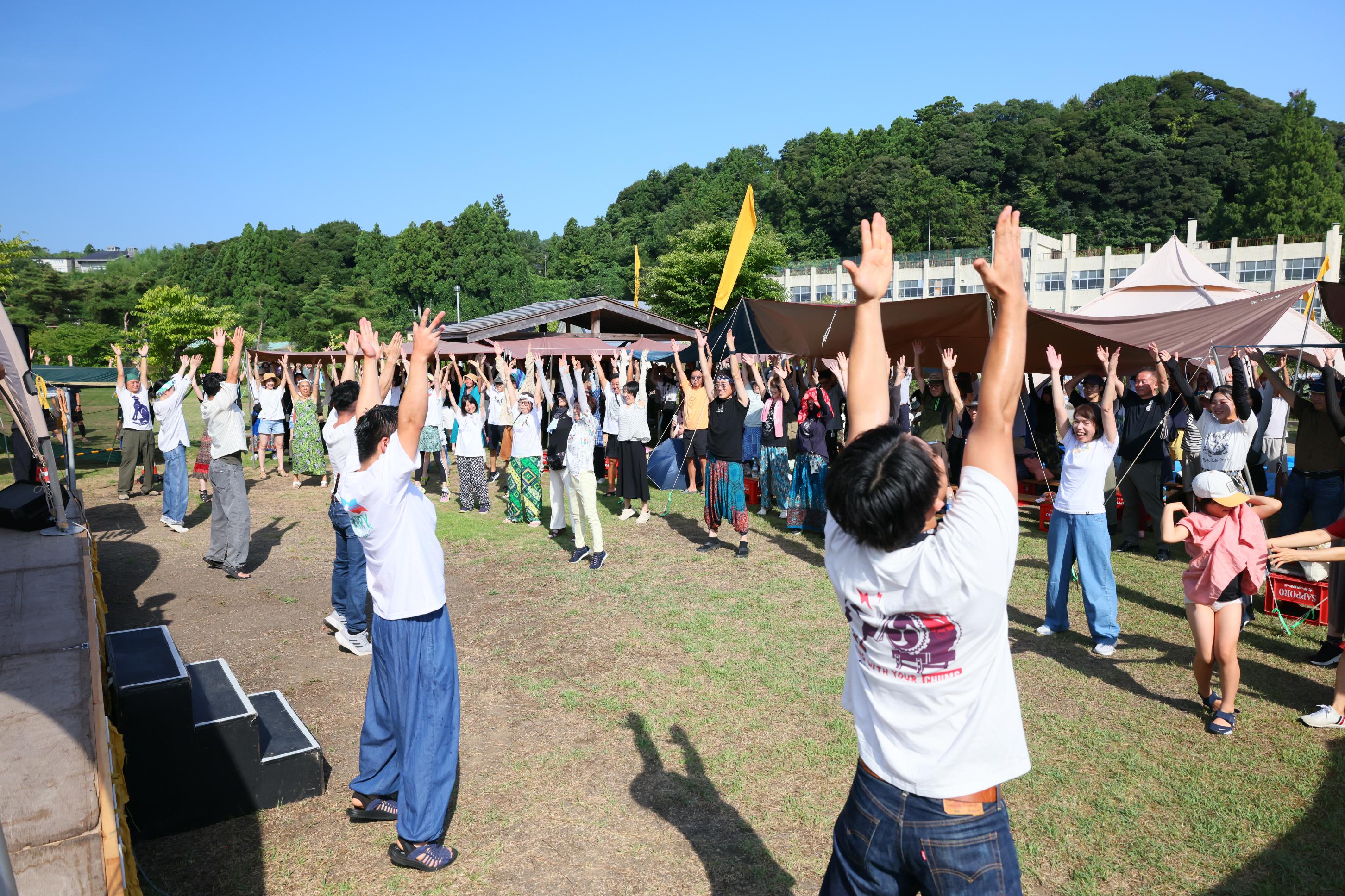 今年もラジオ体操会場は三角公園です。 鼓童メンバーと一緒にのびのび身体を動かして、清々しい1日を始めましょう!